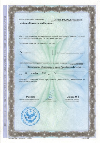 | Адрес местонахождения образовательной организации* | 368211, Буйнакский район, с.Карамахи улица Школьная |