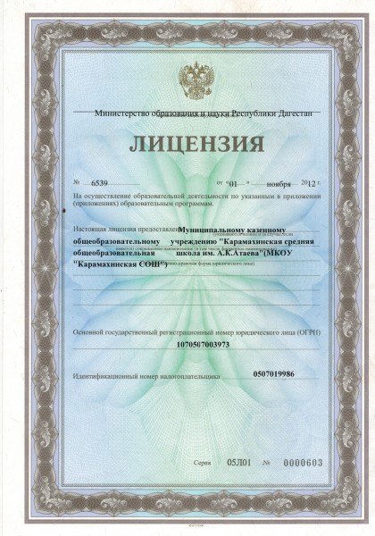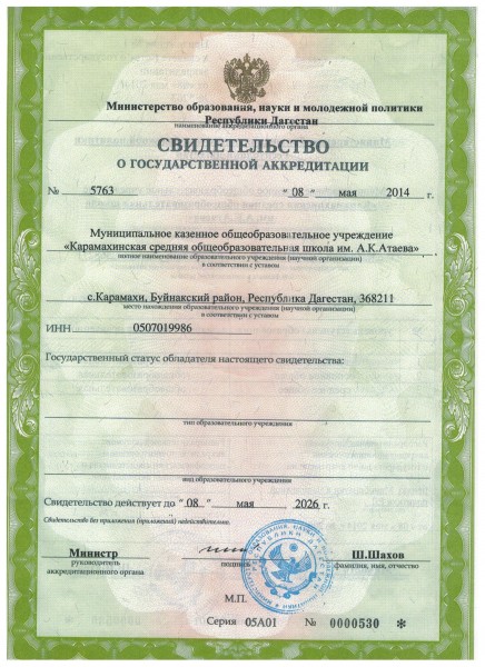 | Полное наименование образовательной организации* | Муниципальное казенное общеобразовательное учреждение "Карамахинская средняя общеобразовательная школа им. А. К. Атаева" |